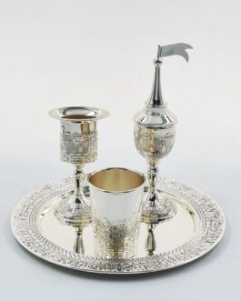 הסט מכיל כוס קידוש, מעמד לנר, מתקן לבשמים ומגש.